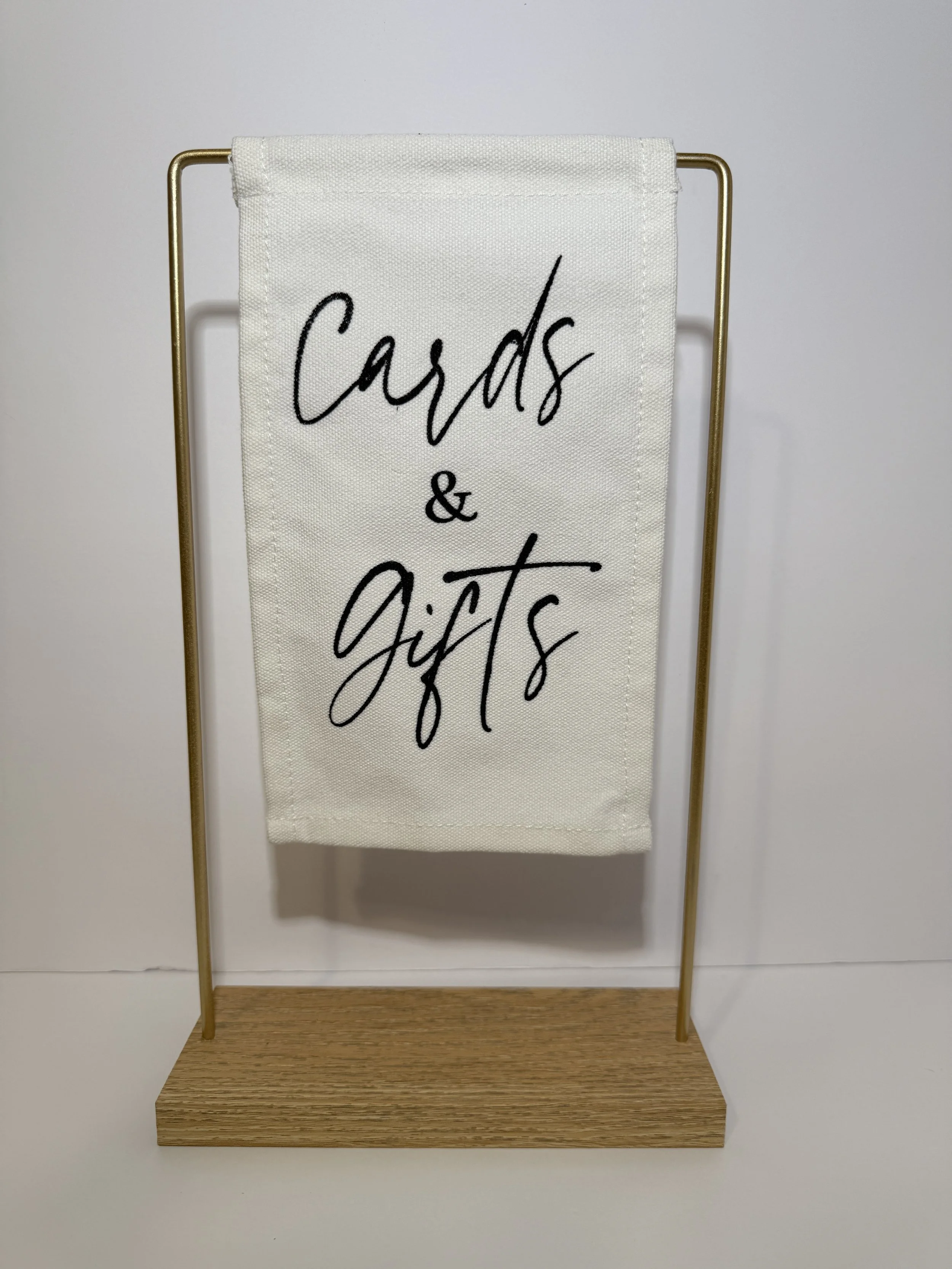 $5 Cards & Gifts Cloth table sign. Gold metal and wooden base