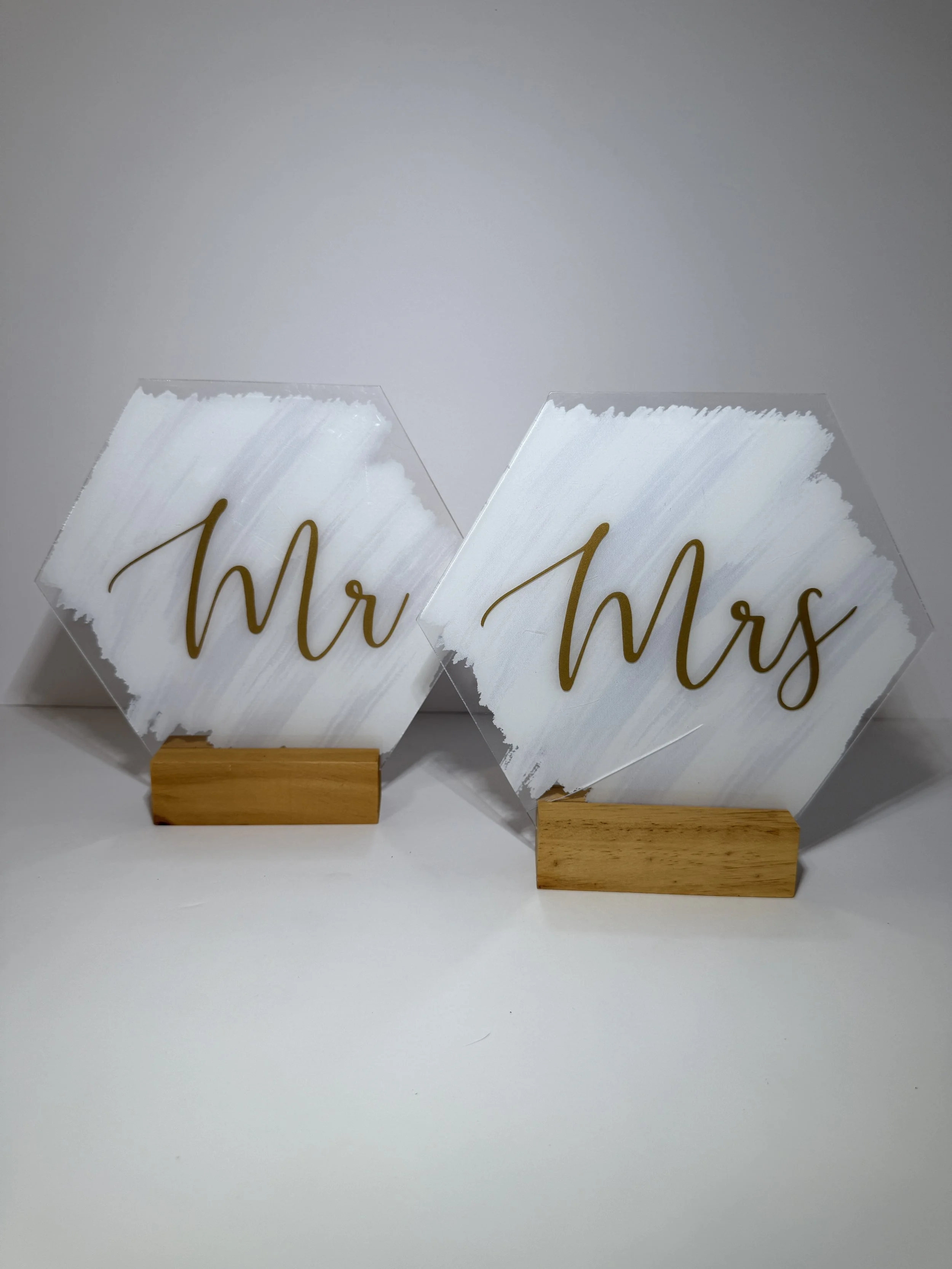 $5 for set. Mr & Mrs gold plastic wood small round signs