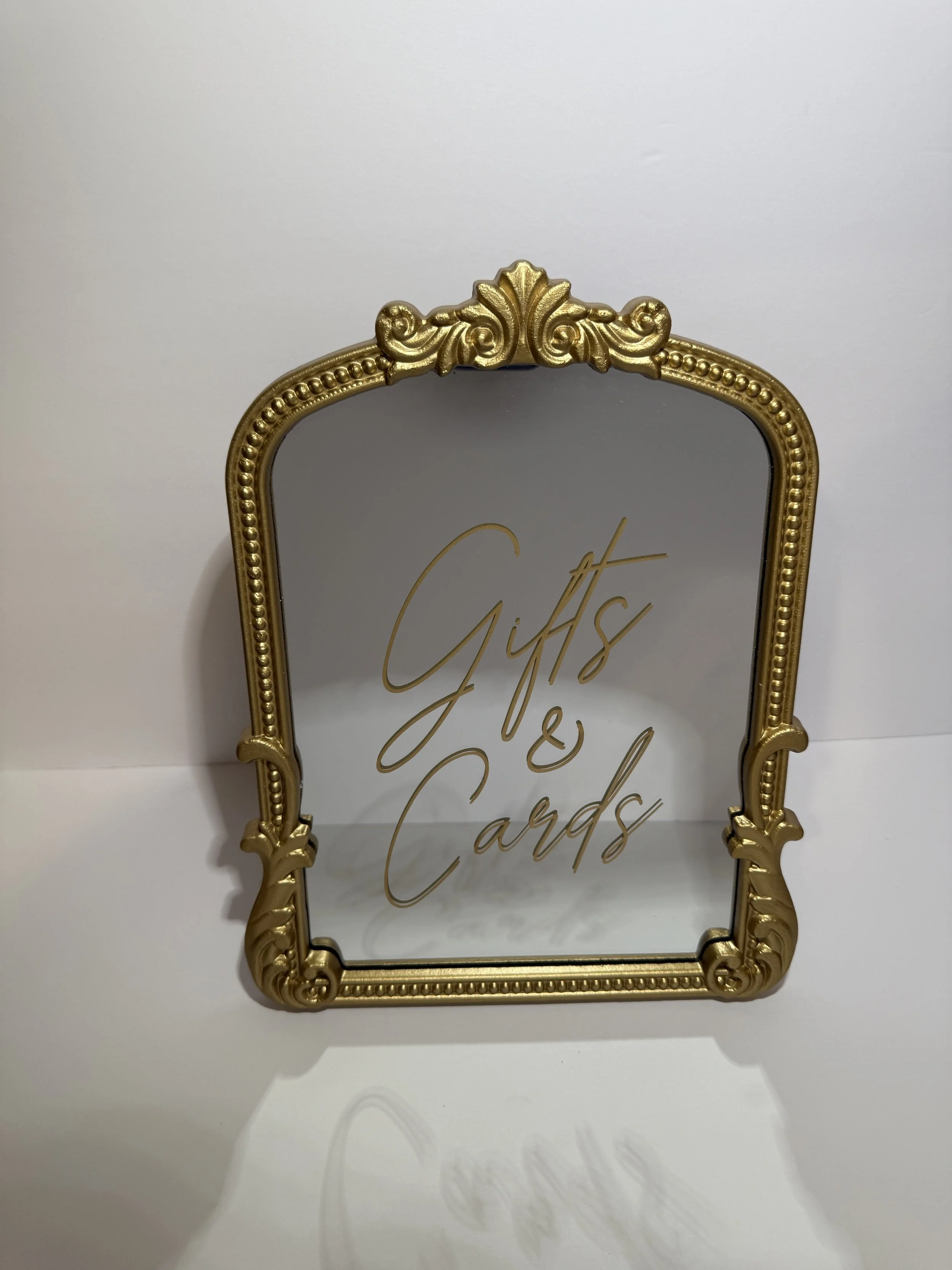 $5. Gifts & Cards -gold mirror table sign
